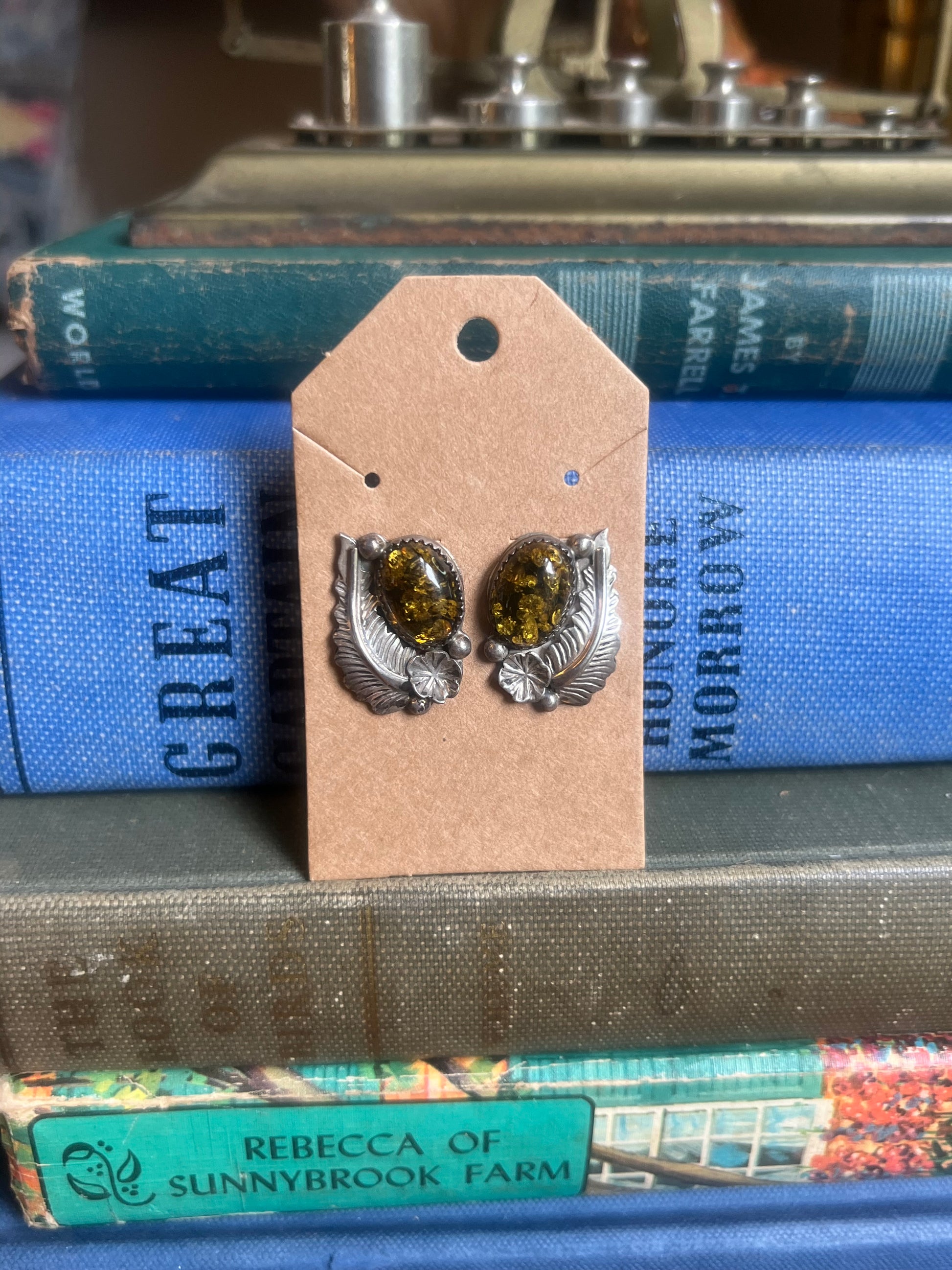 Signed W Amber Stone & Sterling Silver Post Earrings
