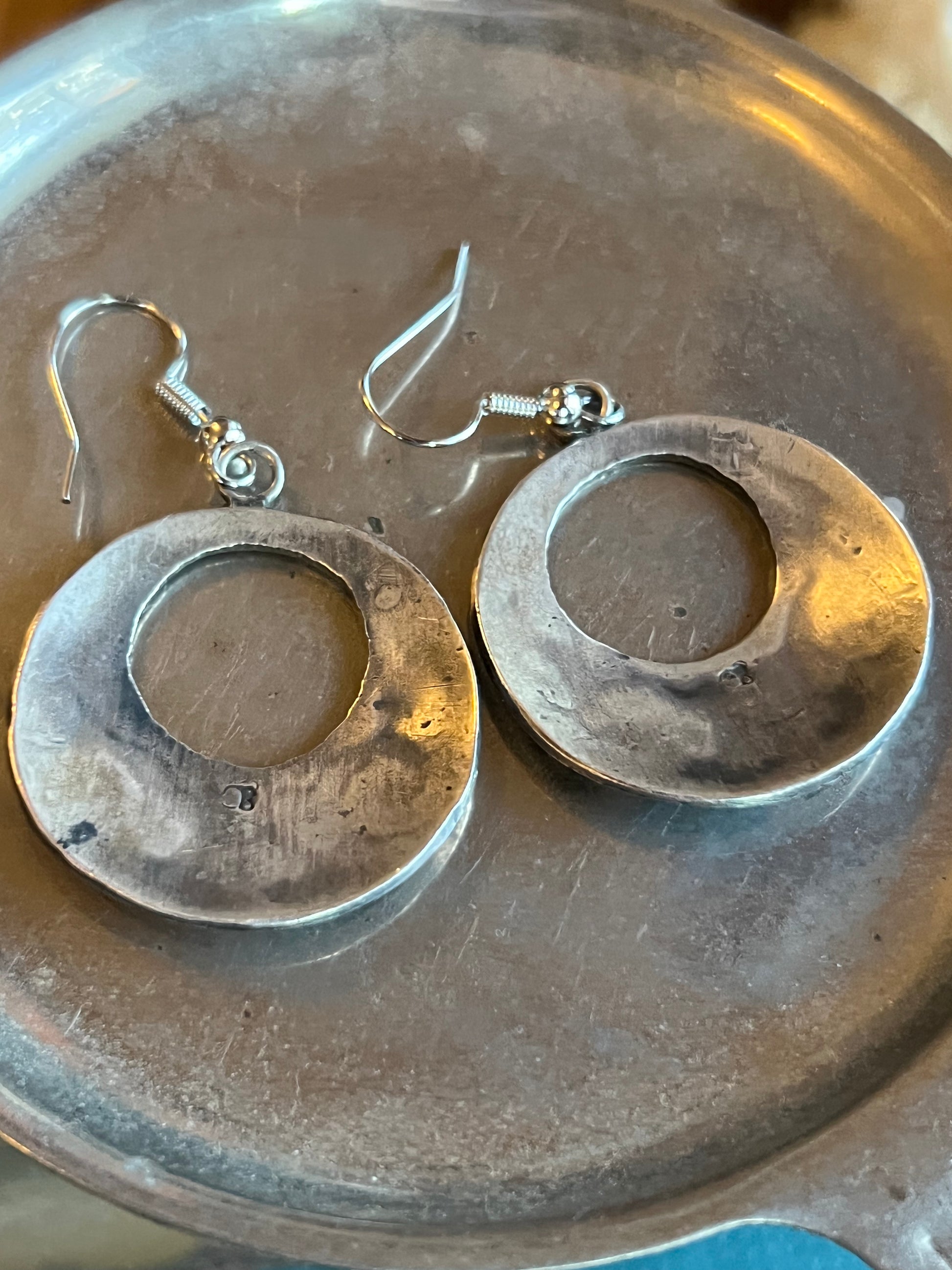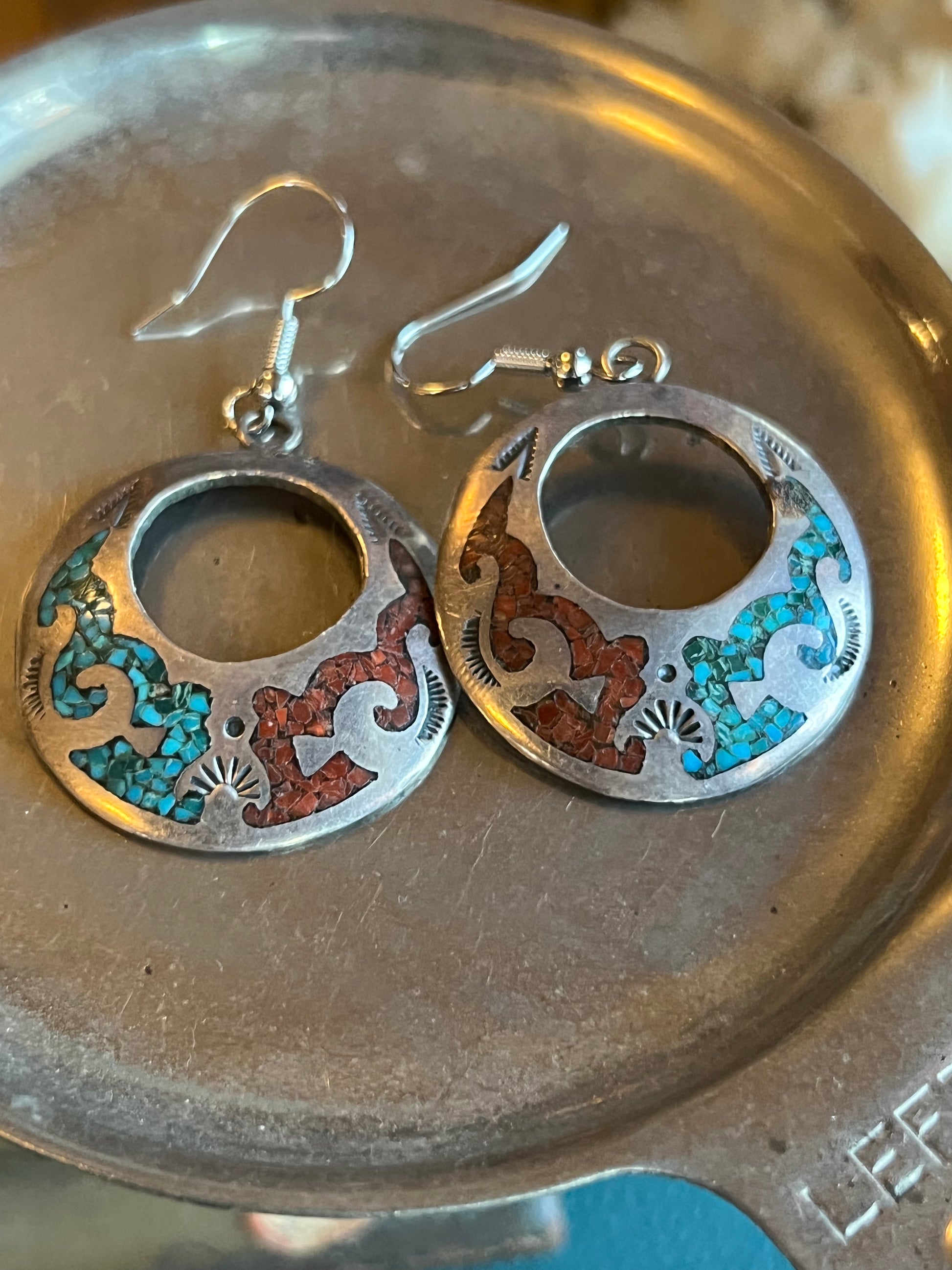 “B” Turquoise & Coral Crushed Inlay Drop Hoops